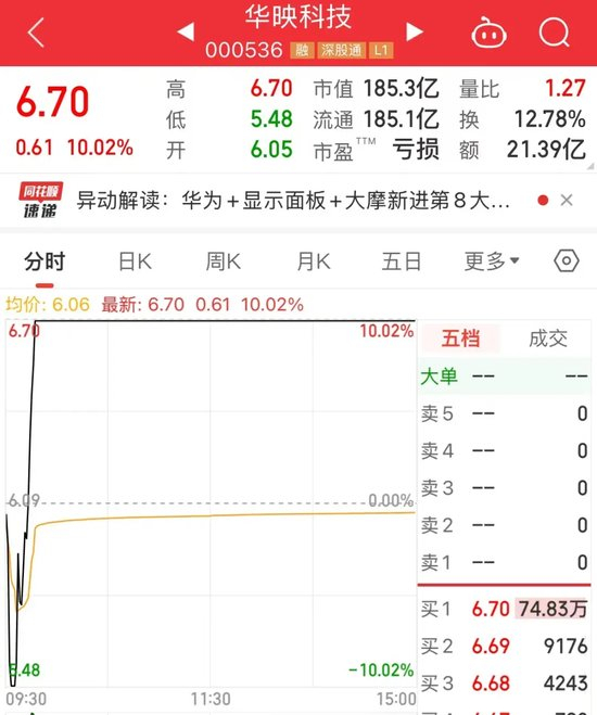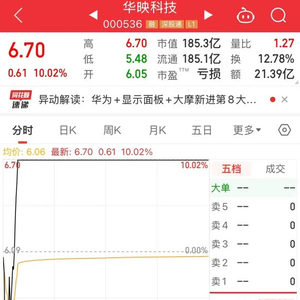以华映科技为例,该股早盘一度被砸至跌停板,随后股价大幅拉升,不到15分钟股价涨停,收盘涨停板封单74.83万手,呈现“地天板”走势。截至目前,该股已连续收获7个涨停板,最新收盘价创七年来新高。