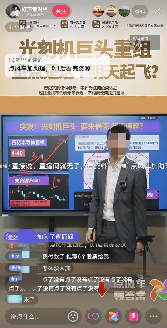 在直播间“好声音财经”中,主播不断强调“6000亿光刻机巨头上海微电子或将借壳上市”“与公司实控人关系密切的公司或将成为壳资源”等内容,并在大屏幕上放出了两张遮盖了上市公司名称的新闻及公告截图,暗示“壳资源”公司已经公告更换审计机构,并称这或是停牌宣布收购的前兆。