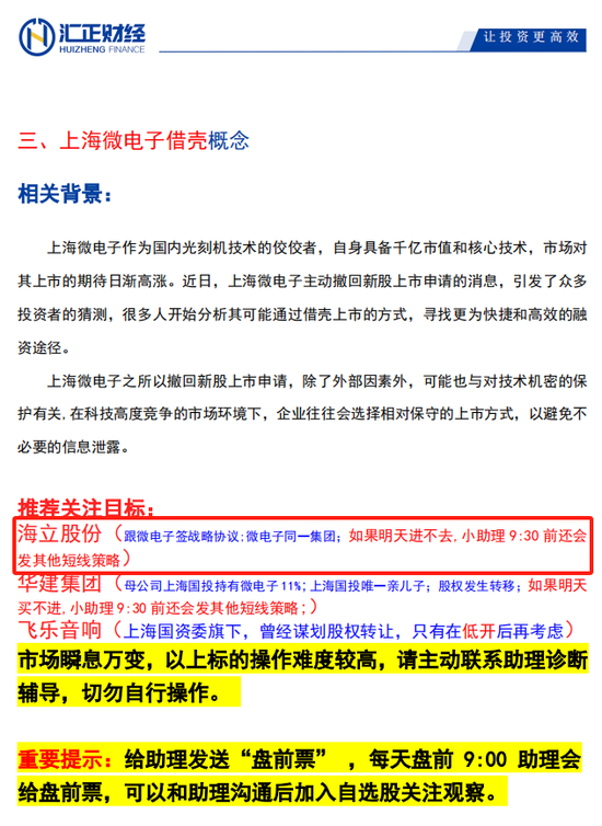 为了确认汇正财经“荐股”详情,蓝鲸新闻记者通过直播间链接联系到了一位汇正财经的投资顾问。根据该顾问发来的资料,所谓的“上海微电子借壳概念”中推荐的首支股票确实为海立股份,除海立股份外,还有华建集团、飞乐音响两只股票。