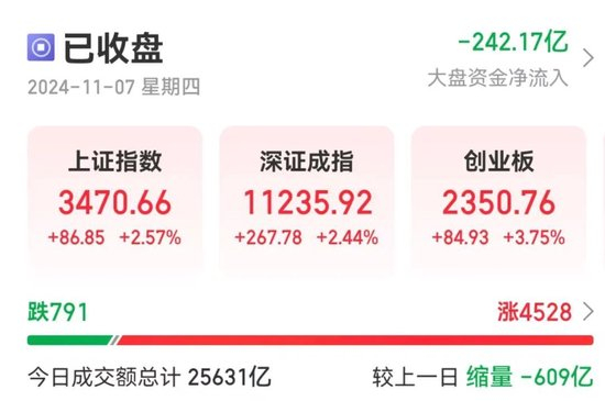 截至收盘,沪指涨2.57%,深证成指涨2.44%,创业板指涨3.75%。沪深北三市全天成交额超2.56万亿元,较上个交易日缩量609亿元。