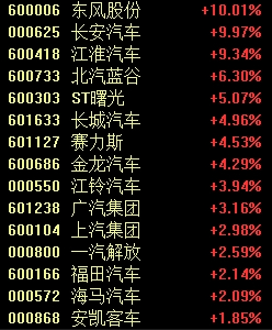 汽车整车板块中,东风股份开盘后“一”字涨停,长安汽车午后涨停,江淮汽车、北汽蓝谷涨超5%,赛力斯、长城汽车、江铃汽车、金龙汽车、广汽集团等跟涨。
