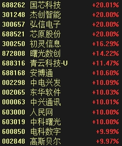 算力概念中,中科曙光午后涨停,续创历史新高,国芯科技、杰创智能等股实现“20CM”涨停,初灵信息、曙光数创等股跟涨。
