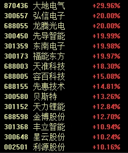 新能源汽车板块中,大地电气实现“30CM”涨停,龙腾光电、先导智能、东南电子等股“20CM”涨停,天准科技、先惠技术等股跟涨。