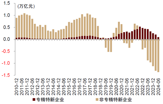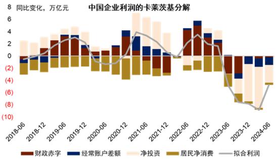 2021年以来,A股上市公司亏损面(亏损企业数占总企业数比重)有所扩大,2021-2024年,上半年税息折摊前利润(EBITDA)亏损的上市企业占比有所上升。从部门平衡的角度来看,企业利润的来源有四个,包括财政赤字、居民净消费、企业净投资和对外顺差。企业利润同比变化的分解显示,2023年2季度,财政赤字的变化对企业利润的影响较大,企业部门的投资对企业利润影响不大。但这个现象近期出现变化,净投资成为2024年企业利润最大的影响因子(图表8),这可能说明企业部门自身的紧缩已经成为影响企业利润的重要因素。