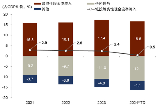 如果用1-9月的数据结合样本城投公司半年报的数据推算,2024年1-9月,广义财政筹资性净收入与GDP的比例可能为9.8%,较2023年的12.7%下降了2.9个百分点(图表12),其中1.46个百分点来自土地出让收入的下降,1.92个百分点来自城投筹资性净现金流的减少(其中0.72个百分点由融资减少贡献、1.20个百分点由还本付息压力增加贡献)。