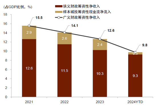 注:样本城投公司包括了2000余家在2021年到2024年上半年均报告现金流量表的城投公司。狭义财政筹资性净收入主要包括政府债务融资以及土地出让收入,广义财政筹资性净收入包括城投与狭义财政筹资性净收入。详情请参见《从筹资现金流看财政力度》