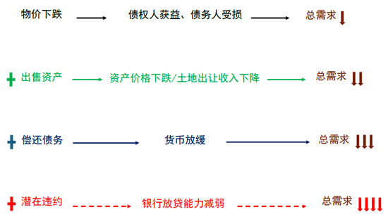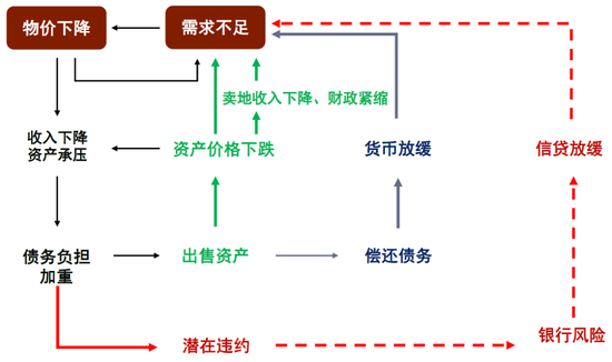 与传统经济周期不同,金融周期下行阶段,低物价循环的机制更复杂,主要体现为楼市调整和债务偿还带来了较强的“明斯基效应”和“费雪效应”(图表3)。经济周期下行时期,物价调整和循环的基本机制是“庇古效应”和“托宾效应”,即物价下行导致债权人获益、债务人受损,但债务人支出倾向更高,因此总需求下降。金融周期下行时期,房价调整带动财富变化,进一步影响总需求(“明斯基效应”)。同时,“土地金融”机制受阻,明斯基效应也增加了地方财政的压力,进而影响总需求。物价调整还推升实际利率,债务人偿债动机上升而借贷动机下降,导致货币增速放缓、总需求下降(“费雪效应”)。