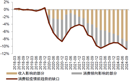从居民端来看,除了财富变化影响消费之外,就业形势的变化和收入增速放缓也影响其消费。 如果将居民消费支出与其疫情前趋势的偏离分解为消费倾向和收入两部分,收入变化的影响持续加大(图表9)。整体看,就业压力在不同人群中差异较大。2024年9月15日国务院发布《关于实施就业优先战略 促进高质量充分就业的意见》[5] ,体现了政府对就业形势的高度重视。