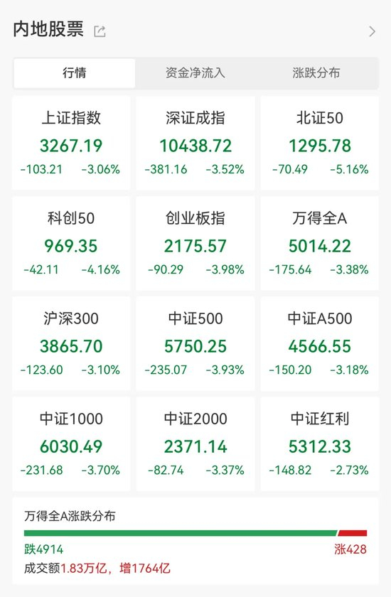 11月22日,A股全天低开低走,三大指数午后大幅下挫。截至收盘,上证指数跌3.06%,深成指跌3.52%,创业板指跌3.98%。全市场4914股下跌,428股上涨。成交额18321.84亿元,较昨日放量约1764亿元,换手率4.76%。