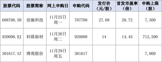 据目前安排,若无变化,下周(11月25日至29日)有3只新股可申购,包括科创板1只、创业板1只和北交所1只。