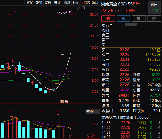 连续4个涨停后,湖南黄金股价达22.26元,总市值为268亿元。
