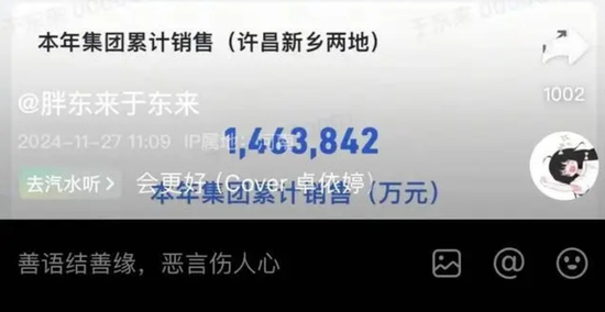 11月27日,于东来在其抖音账号上晒出胖东来本年度经营情况。数据显示,截至11月26日,本年度胖东来集团累计销售(许昌新乡两地)已达146.38亿元,本月累计销售(许昌新乡两地)达11.94亿元。