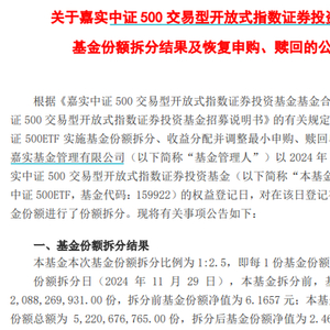 12月2日,嘉实基金发布的《关于嘉实中证500交易型开放式指数证券投资基金基金份额拆分结果及恢复申购、赎回的公告》显示,嘉实中证500ETF以11月29日为权益登记日,对基金份额进行了份额拆分,本次基金份额拆分比例为1:2.5,即每1份基金份额拆为2.5份,拆分后的总份额为52.21亿份,份额净值为2.47元。
