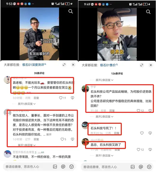 于是,当他分享“雪地越野和沙漠越野谁挑战更大”时,评论区点赞最多的内容是:“昌老板,不能光玩车,管管你的石头科技吧,一个月以来投资者都在哭泣。”