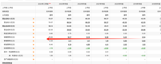 2024年前三季度石头科技销售费用率创下历史新高22.31%。其中2024年第三季度销售费用6.79亿元,与2023年同期相比增长了51.53%;销售费用率达到了26.21%,同样创下季度历史新高。