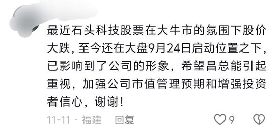 有网友表示,“最近石头科技股票在大牛市的氛围下股价大跌,至今还在大盘9月24日启动位置之下,已影响到了公司的形象,希望昌总能引起重视,加强公司市值管理预期和增强投资者信心。”