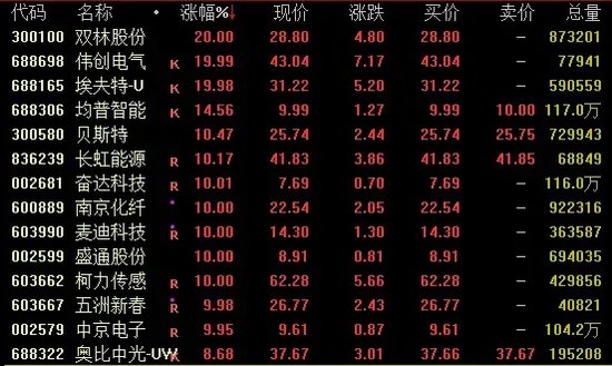 场内超3800股飘红,AI应用概念再度爆发,星环科技、万兴科技、福石控股等涨停;人形机器人概念再度活跃,南京化纤近14日斩获13个涨停板,五洲新春连续5日涨停;培育钻石概念再度拉升,惠丰钻石、沃尔德涨停,黄河旋风斩获3连板;汽车产业链股强势,邦德股份、双林股份、三联锻造等涨停;此外,今日上市的科隆新材、佳驰科技双双大涨,收盘涨幅分别为201.4%、151%,盘中最高涨幅分别为219.7%、214.8%。