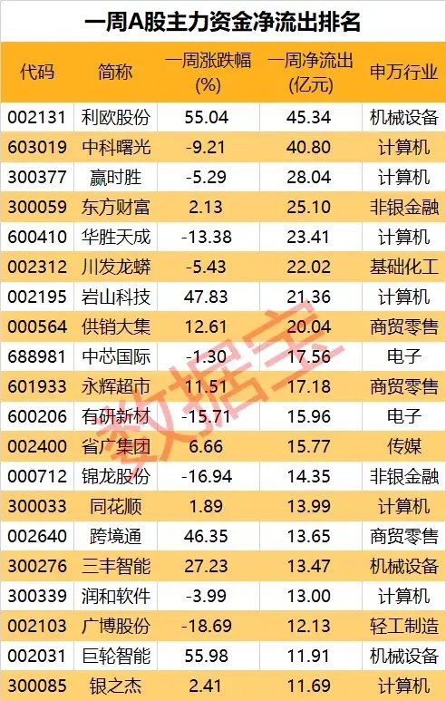 连续5个交易日净流出,一周主力资金流向出炉。