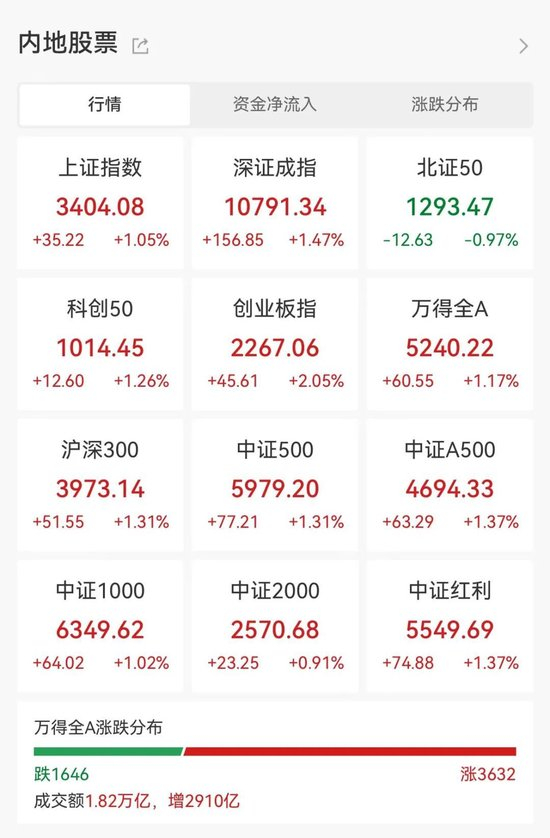 12月6日,A股市场高位震荡。截至收盘,沪指上涨1.05%,成功收复3400点;深证成指上涨1.47%,创业板指涨2.05%。全市场3632股上涨,1646股下跌;成交额18175.73亿元,较昨日放量约2910亿元,换手率4.52%。