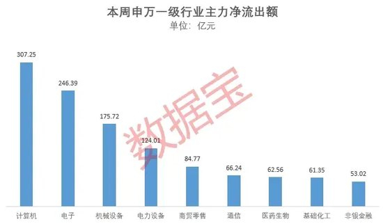 多数申万一级行业遭到主力撤离。计算机、电子、机械设备、电力设备行业一周主力资金净流出金额居前,均超过百亿元,依次为307.25亿元、246.39亿元、175.72亿元、124.01亿元。