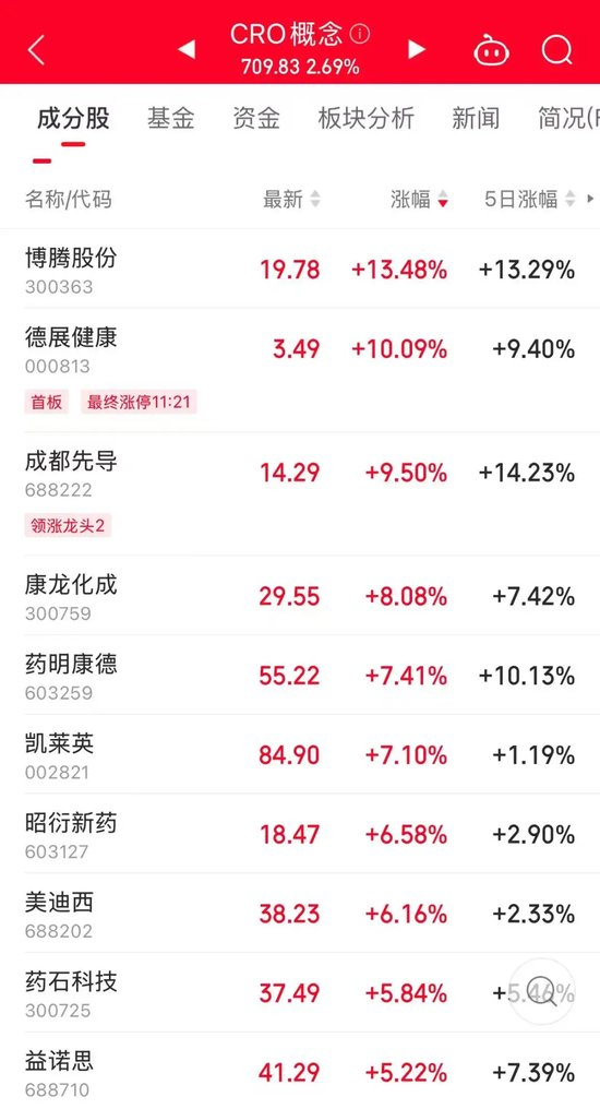 今日,CRO指数大幅走强,成份股多数上涨,其中德展健康涨停,收盘有22.82万手封单;博腾股份大涨13.48%;成都先导、康龙化成涨逾8%;千亿龙头股药明康德以及凯莱英、昭衍新药等多股涨逾5%。