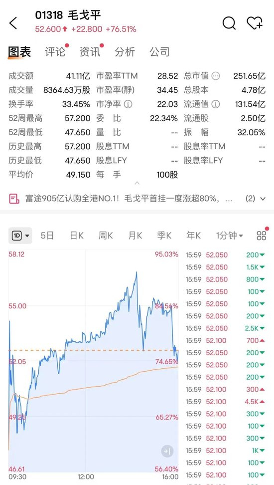 12月10日,“港股国货彩妆第一股”毛戈平上市首日收涨超76%,成交额超41亿港元。盘中更曾一度涨超90%。截至收盘,其总市值达到251.65亿港元。