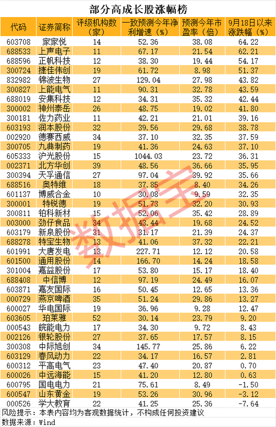 数据显示,合计共有39只个股进入榜单。持续高成长的优质股主要是中盘股,千亿市值股票有2只,分别是北方华创、中际旭创。市值比较高的股票还有山东黄金、国电电力、德赛西威、天孚通信等,均高于500亿元。市值低于百亿元的个股有6只,分别是学大教育、上声电子、劲仔食品、家家悦、通用股份、润本股份。