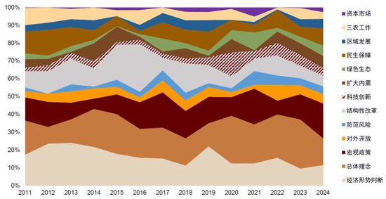 会议文本按主题分为“宏观政策”、“对外开放”、“防范风险”等14个主题,主题篇幅变动与中国经济形势变化与政策指引密切相连。2015-2016期间“供给侧改革”成为全国经济的工作重点,“结构性改革”篇幅明显扩张。2020年以来全球迎来“百年未有之大变局”,经济运行出现一些新特点新趋势,文件在大方向上的指导更多,“总体理念”主题的篇幅增加。“宏观政策”的讨论篇幅近年来逐年增加,且情绪上更积极,反映为了应对内外挑战,“稳增长”政策持续发力,更加给力。