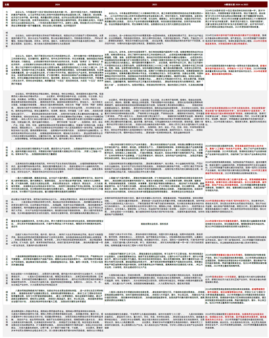 对于每个主题的具体内容,我们让AI把2024年与前一年的会议文本对比,发现2024年政策在总体理念上更重视实操和短期目标,新增对楼市股市稳定的关注,并明确为“十五五”打基础;在宏观政策上的表述较2023年更为积极和具体,财政政策强调“更加积极”和“提高财政赤字率”,并新增“增加发行超长期特别国债”等措施,货币政策转向“适度宽松”;重点任务中,“扩大内需”任务从去年的第二位提升至第一位,更强调提振消费和投资效益,新增中低收入群体增收减负、多元化消费场景、城市更新、房地产市场止跌回稳等措施;会议对“资本市场”主题的着墨篇幅也有提升,强调多层次金融服务体系建设和吸引社会资本,深化投融资改革,增强制度包容性和适应性。