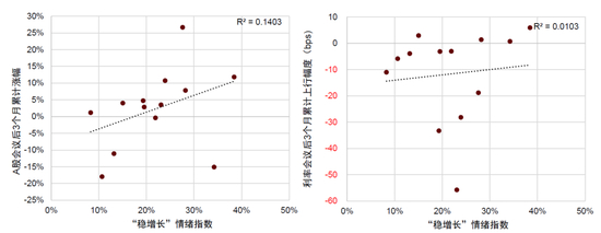图表2:一般而言,“稳增长”情绪指数越高,会议后3个月内股市表现更好,十年期国债利率下行幅度越小