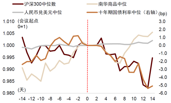 在会议召开之前,股市往往提前计入会议的乐观预期。我们复盘了2010年以来历次中央经济工作会议前后大类资产的表现,发现在会议前两周,市场情绪相对更加积极,沪深300走势中位数窄幅震荡、十年期国债利率走高、商品上涨、人民币走强。