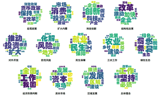 *注:为了凸显各主题差异,我们在词汇云图中去除了在大部分主题中都频繁出现的词汇,如“政策”“经济”“会议”“发展”等;统计区间为2011至2023年