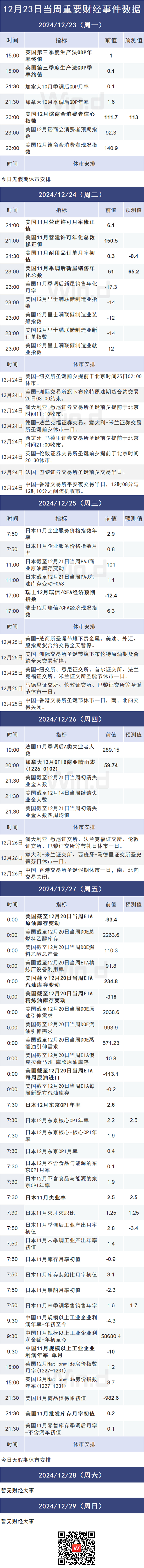 由于圣诞节假期的因素,预计本周海外市场将会显得相对冷清。不过因为仍有少量具有影响力的海外经济数据会发布,需要警惕此时在流动性稀薄的情况下,市场波动可能反而会变得很大的风险。