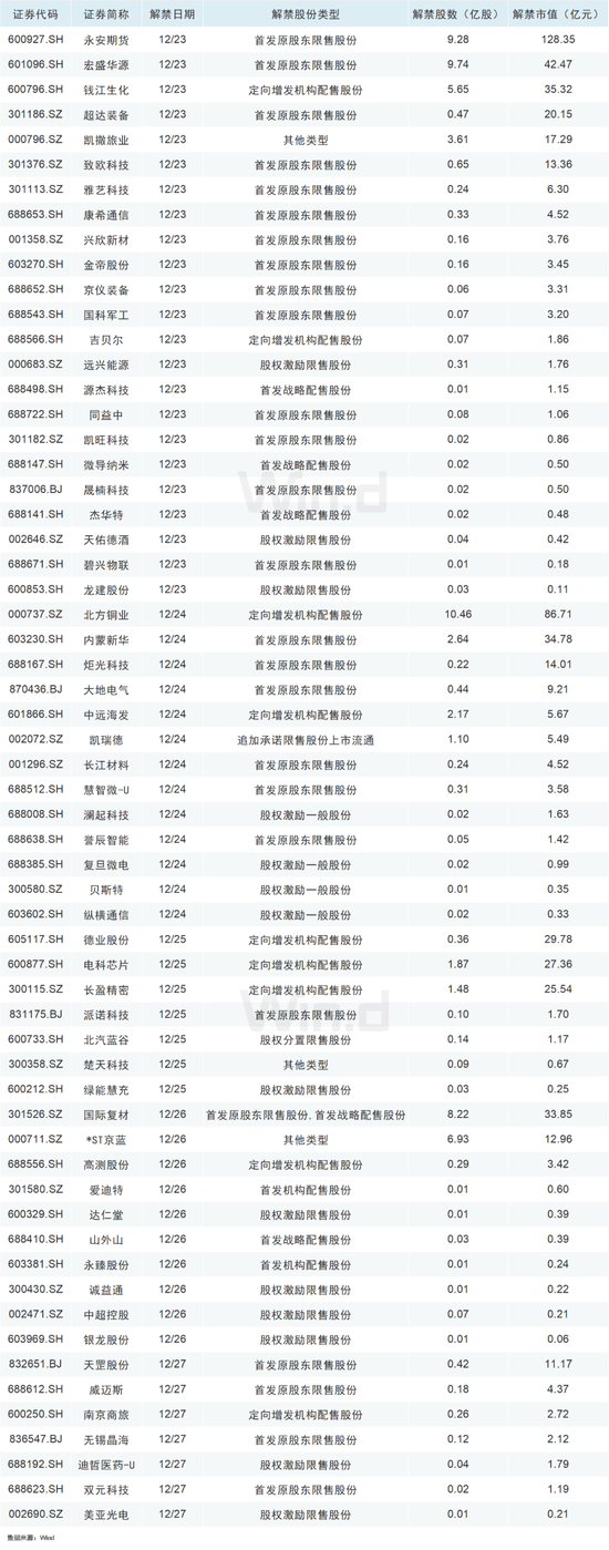 从解禁市值来看,12月23日是解禁高峰期,26家公司解禁市值合计290.83亿元,占本周解禁规模的46.74%。按12月20日收盘价计算,解禁市值居前三位的是:永安期货(128.35亿元)、北方铜业(86.71亿元)、宏盛华源(42.47亿元)。从个股的解禁量看,解禁股数居前三位的是:北方铜业(10.46亿股)、宏盛华源(9.74亿股)、永安期货(9.28亿股)。
