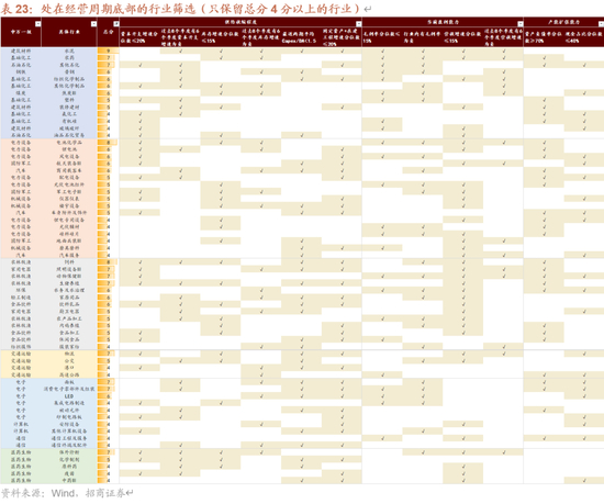 基于上述经验,识别处在出清左侧,但接近经营周期底部,供给端调整充分的行业。筛选条件兼顾调整力度和调整时间,具体细则如下:1)资本开支增速、固定资产+在建工程增速分位数≤25%,库存增速、毛利率、营收增速分位数≤15%,各记1分。2)过去8个季度有6个季度资本开支增速、库存增速、营收增速为负,各记1分。3)行业内存在公司毛利率为负,记1分。4)Capex/DA≤1.5,记1分。5)资产负债率分位数大于70%、现金占比分位数小于40%,各记1分。(注:①分位数统计起始于2010Q1,流量型指标均为TTM口径;②诸如“过去8个季度有6个季度”该类统计均使用累计值口径;③综合考虑市值和营收规模以及内部差异性,使用申万二三级行业混合)。
