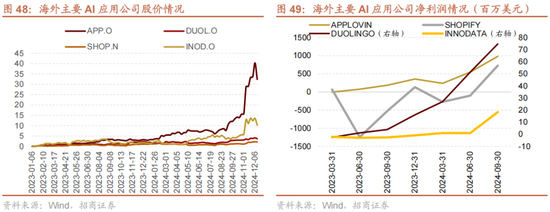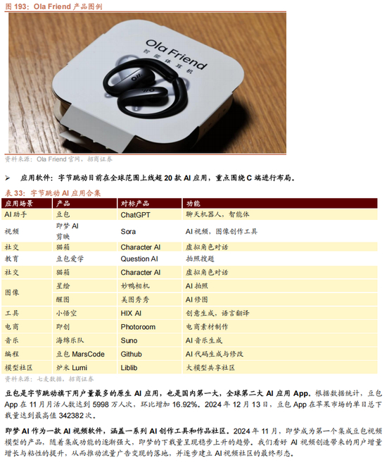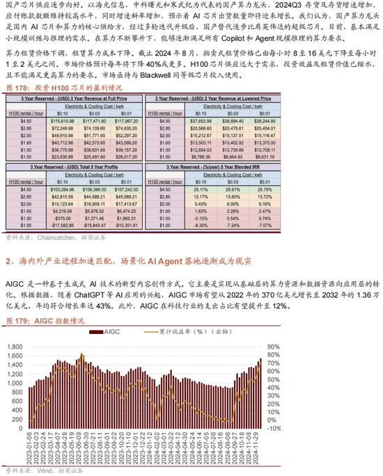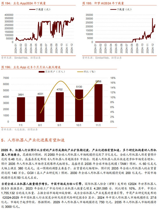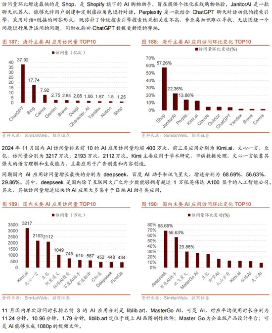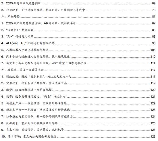 ⚑ 产业趋势及政策展望:AI产业链投资方向有望向AI应用方向持续扩散。2024年下半年以来,AI应用端产品落地加速,呈现出国内和国外共振的产业趋势:AI Agent开启了AI产业链的全新演绎之路,随着AI Agent底层技术日益增进,硬件效率提升开启AI+产业新篇章。AI应用方向,国外方面,Chatgpt访问量持续创造历史新高,美股AI应用公司业绩不断超预期;国内方面,字节旗下的AI应用豆包火爆全网,仅次于Chat GPT。人形机器人方面,特斯拉Optimus人形机器人技术再度升级,国内厂商不断推出人形机器人新产品。消费电子方面,苹果推出Apple Intelligence的iPhone16系列,华为、小米、OPPO、vivo、荣耀均已发布新机,将AI与光学功能作为旗舰机型的亮点。汽车智能化方面,特斯拉推出无人驾驶出租车Cybercab,国内的厂商也加快智能驾驶和新款车型的发布华。展望2025年,需要重点关注“AI+”产业趋势下AI Agent,人形机器人,AI应用,汽车智能化,消费电子AI化五大细分方向的进展。政策端:展望2025年,建议关注政策十大领域,一是财政有望更加积极,建议关注三大发力方向;二是货币政策将适度宽松,但需关注外部两大事件对降准降息节奏的影响;三是消费领域,以旧换新政策有望进一步扩大规模及支持范围,整个消费板块都值得关注;四是投资领域,建议重点关注设备更新(尤其是央企设备更新)与“两重”持续发力;五是低空经济,建议关注应用场景落地;六是车路云,建议重点关注应用场景落地;七是综合整治内卷式竞争,新一轮供给侧改革有望开启。八是数据要素,建议重点关注公共数据应用落地;九是自主可控,建议关注信创、国产算力、光刻机等;十是资本市场,建议重点关注央国企并购重组。