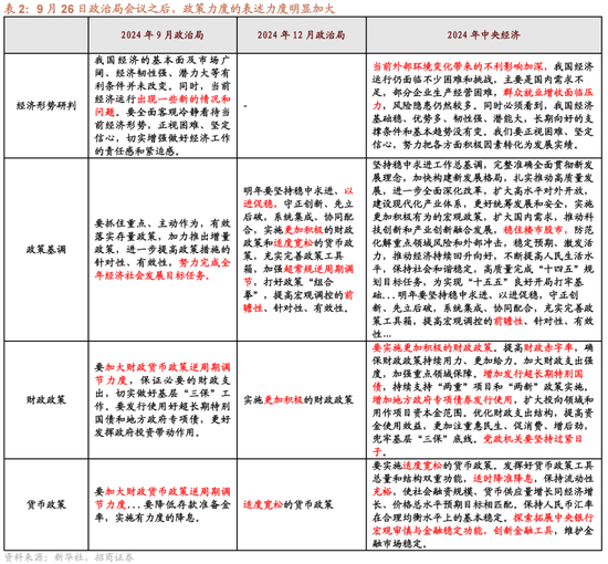 自9月26日政治局会议以来,政策力度开始明显加大,金融、房地产及财政等领域政策加速发力提效,9月26日政治局会议提出“要增强做好经济工作的责任感和紧迫感”,“加大财政货币政策逆周期调节力度”;而在12月召开的政治局会议提出要“加强超常规逆周期调节”,“超常规”这个词在中国重要政策文件中,并不多见。并且提出“实施更加积极的财政政策”,“适度宽松的货币政策”,而适度宽松的货币政策的提法,上一次出现,还要追溯到2008年和2009年的中央经济工作会议。