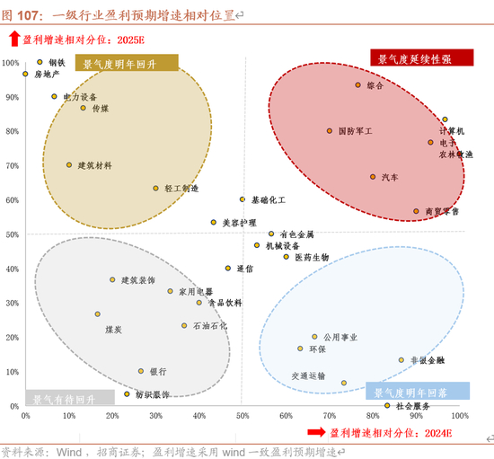 ● 分行业,统计一级行业2024全年和2025年全年的盈利增速在全部一级行业中的分位(取Wind一致预期),分别作为横纵两轴。根据盈利增速进行横向对比,考察景气水平的相对变化。可以看到,从相对视角:1)盈利景气2025年预计提升的行业:电力设备、传媒、房地产、钢铁、建材等。2)盈利景气2025年高位维持的行业:军工、汽车、计算机、电子、商贸零售等。