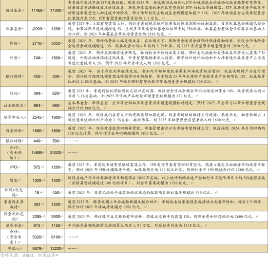 ⚑ 流动性展望:ETF渗透率有望加速提升。展望2025年,随着国内政策发力和经济基本面改善,市场风险偏好将继续回暖,资金供给端的规模有望较2024年继续改善,其中ETF在居民资产配置中的渗透率有望加速提升,ETF有望贡献主力增量资金;外资有望回流,保险资金入市规模随着保费收入改善而扩大,融资资金随着市场风险偏好改善有望反复活跃。资金需求端在市场改善后整体有望回升,IPO、再融资、股东减持等或较2024年扩大。综合供需测算,2025年 A股资金或净流入1.2万亿元。