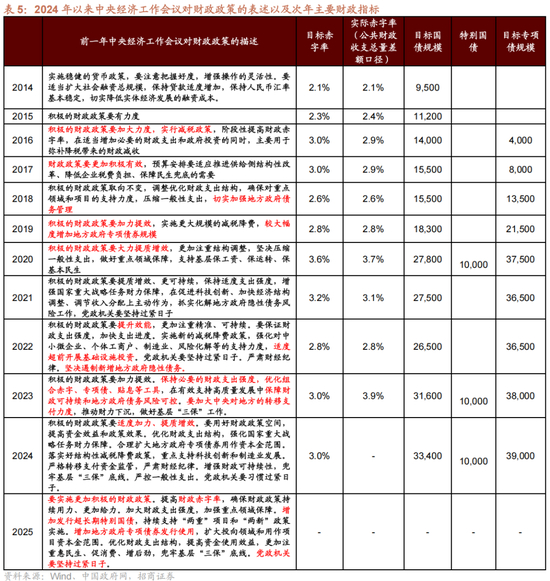 而在2024年底的中央经济工作会议中,用更加具体的表述——“提高财政赤字率”,提高赤字率在历年中央经济工作会议中并不常见,在2015年和2020年出现过。而2025年将会再度迎来财政赤字率的提高”。除此之外,中央经济工作会议中还提到增加发行超长期特别国债,持续支持“两重”项目和“两新”政策实施。增加地方政府专项债券发行使用,而在货币政策层面,更加具体的提出“适时降准降息,保持流动性充裕”。由此我们看到,整体的宏观政策,迈向了更加明显的“宽松”。