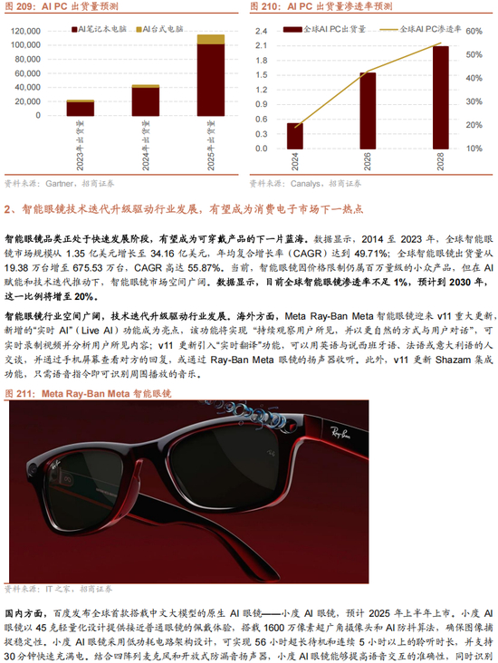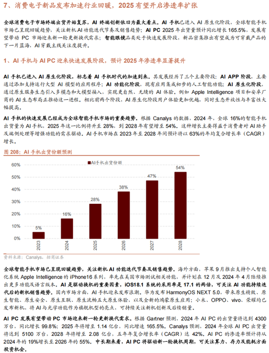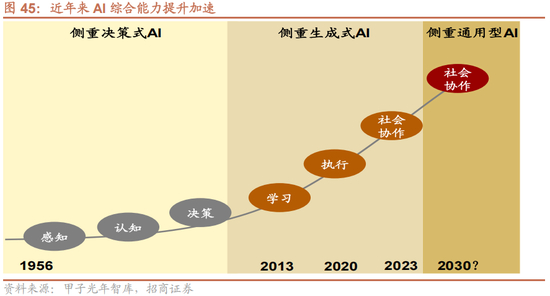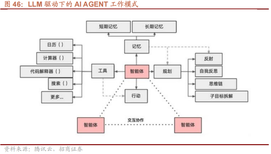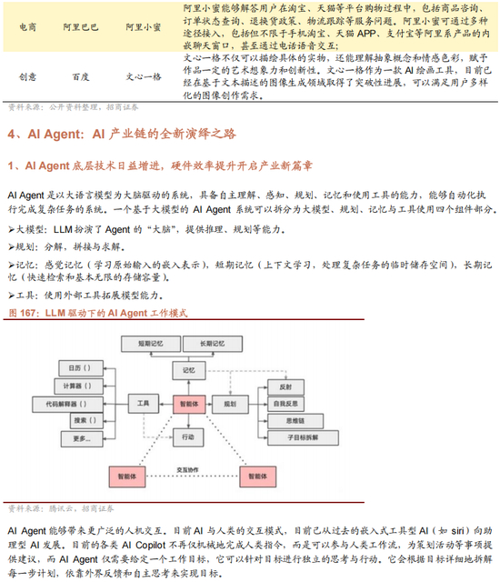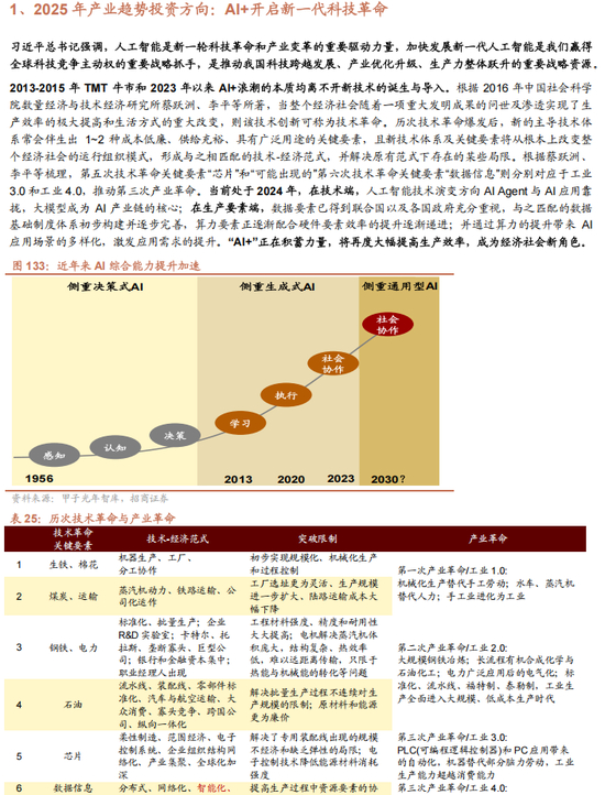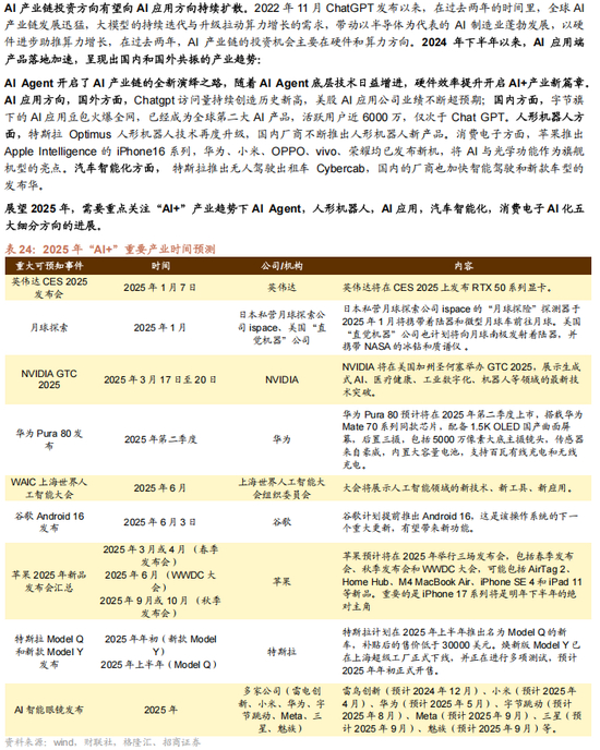 AI+的崛起由生产要素的创新性配置,技术革命性突破,产业深度融合与转型而催生。人工智能作为新一轮科技革命的“领头羊”,将驱动以“AI+”为核心的全新演绎之路:国产AI算力的发展日新月异,崛起已是大势所趋,并空前催化产业链硬件革命;同时,算力的提升扩展AI的场景化应用面积,AI+应用迎来拐点。AI产业链投资方向有望向AI应用方向持续扩散。2022年11月ChatGPT发布以来,在过去两年的时间里,全球AI产业链发展迅猛,大模型的持续迭代与升级拉动算力增长的需求,带动以半导体为代表的AI制造业蓬勃发展,以硬件进步助推算力增长,在过去两年,AI产业链的投资机会主要在硬件和算力方向。2024年下半年以来,AI应用端产品落地加速,呈现出国内和国外共振的产业趋势。产业赛道方面,需要重点关注“AI+”产业趋势下AI Agent,人形机器人,AI应用,汽车智能化,消费电子AI化五大细分方向的进展。