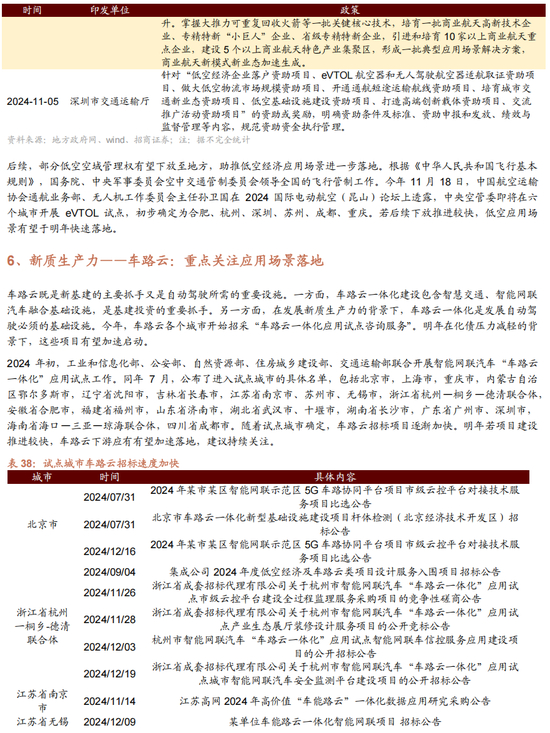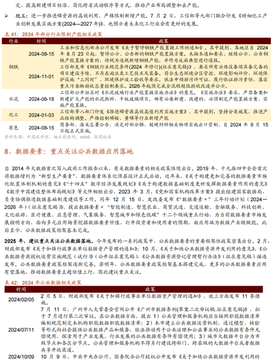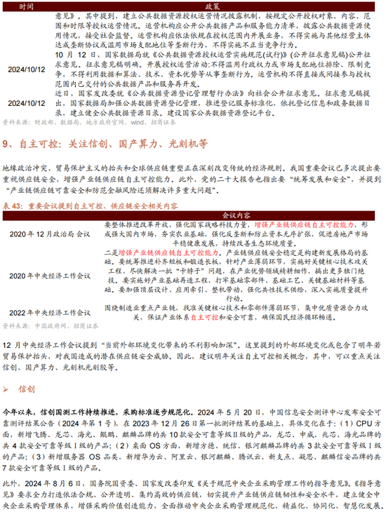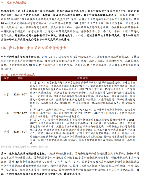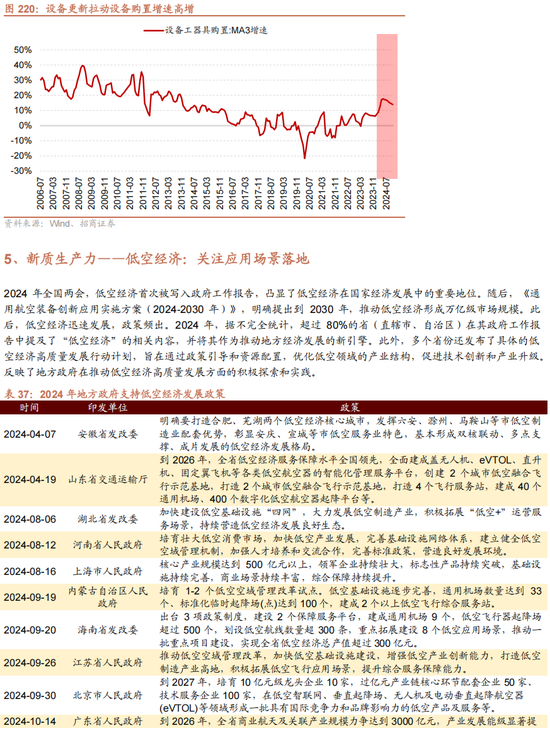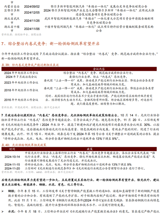 产业政策方面,政策十大领域,一是财政有望更加积极,建议关注三大发力方向;二是货币政策将适度宽松,但需关注外部两大事件对降准降息节奏的影响;三是消费领域,以旧换新政策有望进一步扩大规模及支持范围,整个消费板块都值得关注;四是投资领域,建议重点关注设备更新(尤其是央企设备更新)与“两重”持续发力;五是低空经济,建议关注应用场景落地;六是车路云,建议重点关注应用场景落地;七是综合整治内卷式竞争,新一轮供给侧改革有望开启。八是数据要素,建议重点关注公共数据应用落地;九是自主可控,建议关注信创、国产算力、光刻机等;十是资本市场,建议重点关注央国企并购重组。