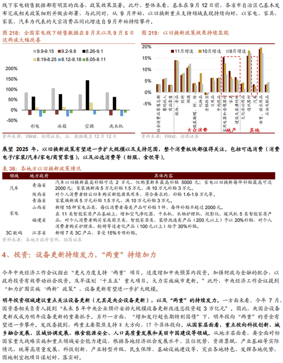 总体来看,在地产企稳,地产链对于消费拖累减轻后,再辅以较大的规模的消费支持或者刺激政策,我们认为2025年的消费增速有望较2024年有一定程度的回升。