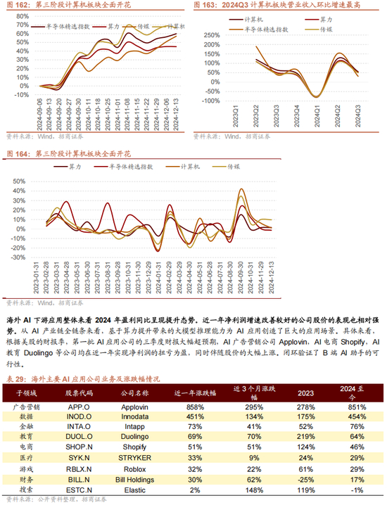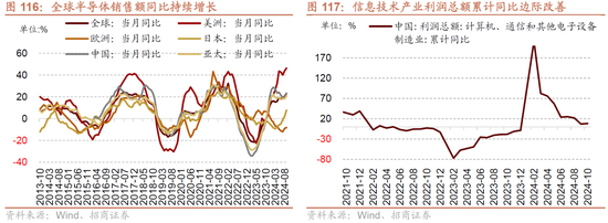 具体来看,电子需求端延续回暖,手机、PC等出货量今年以来延续温和复苏,全球半导体销售额连续多月正增长,库存持续改善,供给端边际改善,产能利用率回升,明年在AI创新终端放量以及自主可控领域渗透加速下,有望延续较高景气。计算机方面,今年以来需求偏弱,业绩有所承压,往后看,2025年化债和信创政策有望持续发力,收入端有望边际改善,叠加AI催化和智算建设提速,行业有望迎来创新周期。通信方面,今年硬件受益于算力需求拉动表现优于软件,明年服务器、液冷等仍将持续受益于AI算力需求景气,同时低空经济政策频频加码,产业发展有望提速。传媒方面,国产游戏及短剧海外市场需求活跃、游戏版号发放节奏加快、人工智能赋能创新与提效,带动今年传媒行业收入和盈利整体向好,未来在文化出海进程加速,AI应用落地驱动下有望持续复苏。