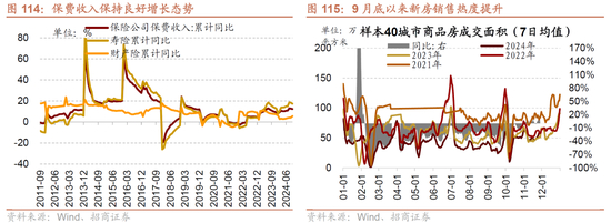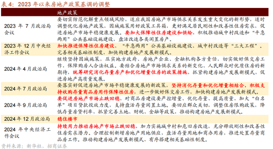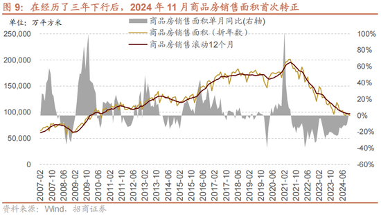 2023年7月开始,对房地产定调发生重大变化,7月政治局会议提出“适应我国房地产市场供求关系发生重大变化的新形势”,此后的房地产政策逐渐宽松和加力支持。在2024年中央经济工作会议中提出“持续用力推动房地产市场止跌回稳”。至2024年11月,在政策不断发力推动下,在基数明显降低后,商品房销售额终于出现了单月转正。房地产销售额经过了长达三年多的下行后,出现了企稳的曙光。