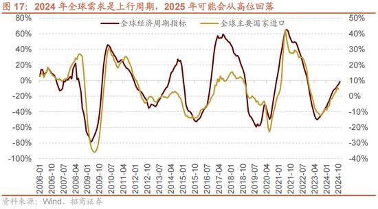 那么反过来,2025年就有可能会面临高基数以及已经进行备货后,自中国进口需求降低的局面,这种情况在2021~2022年也出现过,2021年由于全球疫情反复,自中国加大了进口和备货,中国出口增速高于全球代表性国家进口增速,而在2022年这种关系又反过来。