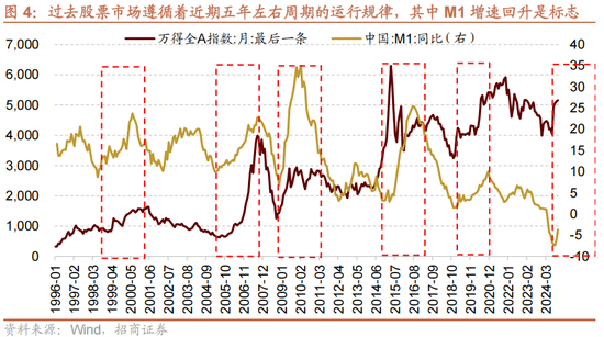 当然,随着经济政策的逐步发力并显现成效,市场在关键时间节点上也迎来了重要拐点。具体而言,这些拐点分别出现在1999年年初、2004年年底、2009年年初、2014年年底以及2019年年初。而观察当前形势,M1增速极有可能在11月或12月已经形成底部,与此同时,市场在9月底已呈现出显著反弹态势。这一系列动态表明,当前的股票市场似乎依然遵循着五年周期的运行规律。