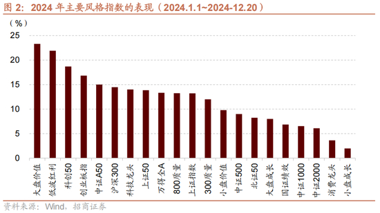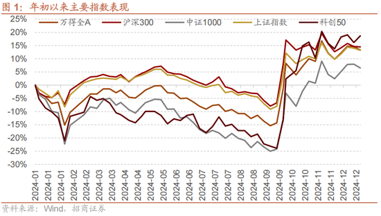 最终,2024年初至12月20日,主要指数录得了上涨,上证指数上涨13.2%,WIND全A上涨13.3%,沪深300指数上涨14.5%,科创50上涨18.7%。我们在中期策略报告中重点推荐的中证A50和科创50,均在下半年出现了大幅上涨,在主要宽基指数中涨幅靠前。