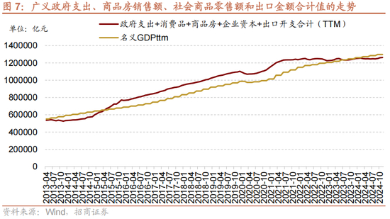 在这种整体稳定的背后,是需求结构的变化,2021年之前,基本所有部门的总需求都是以震荡上行的形式,2021年中国开启了针对房地产和地方政府债务风险的化解进程,在此后的三年,房地产销售面积和金额明显下降,政府支出在收入下降和化债的背景下也相对承压,广义政府支出加商品房的销售呈现下行趋势。