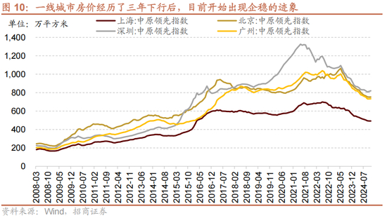 房价和地产销售相关联,2021年开始,全国主要房价呈现下行的趋势,和地产销售的情况类似,在2024年地产支持力度不断加大后,一线城市二手房率先出现了企稳的态势。同样,由于当前房贷利率较低,随着政策进一步发力,2025年一线城市房价企稳的概率进一步加大。